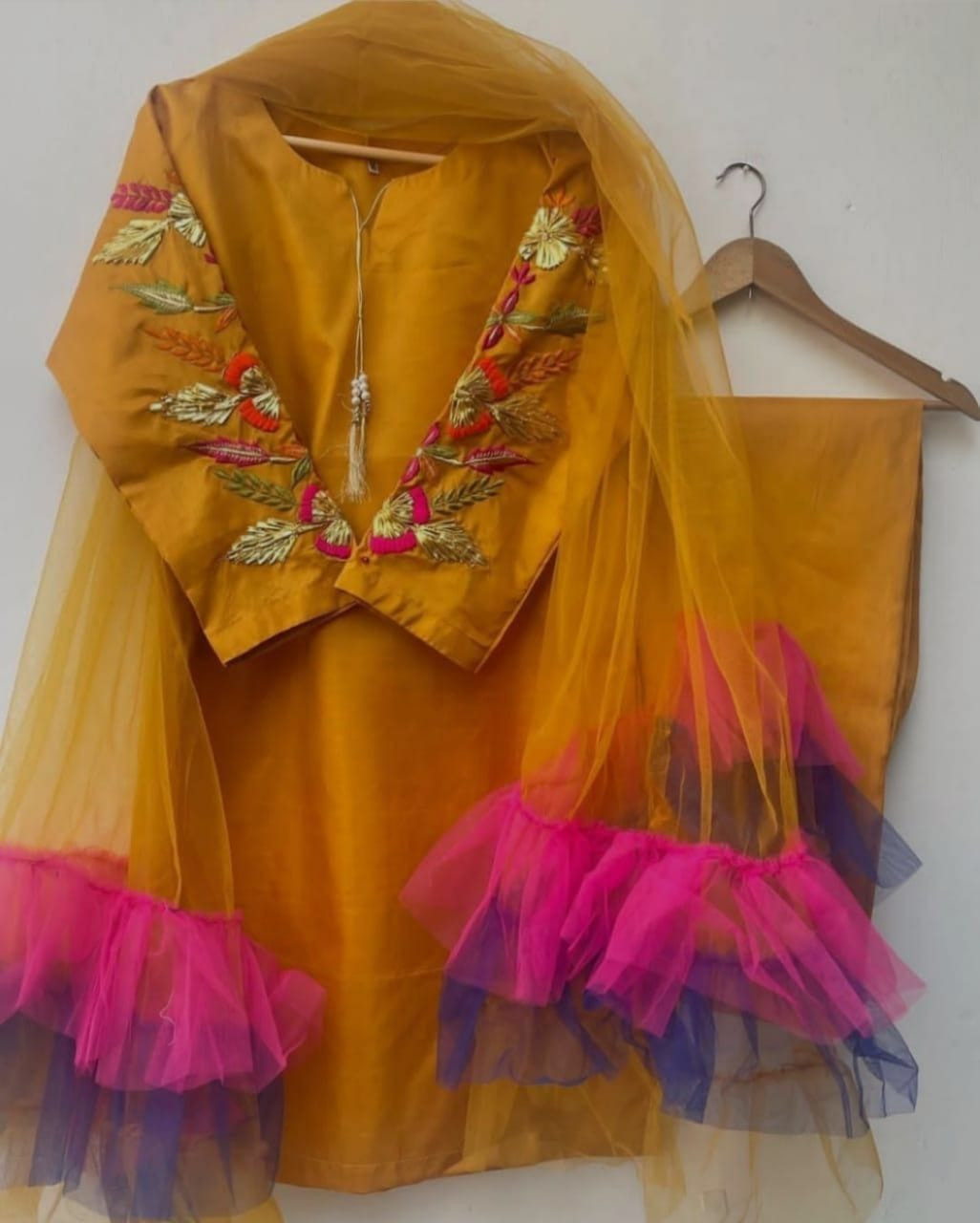 A stunning Kataan silk dress featuring beautifully embroidered sleeves and a vibrant frill dupatta, perfect for festive occasions.
